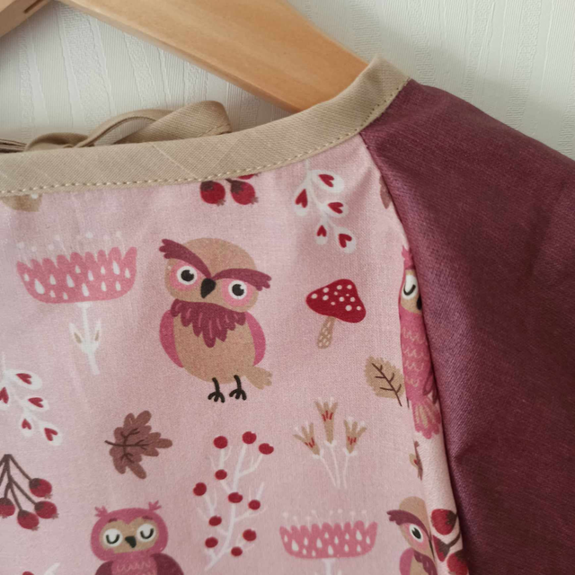 Motil chouettes sur fond rose et manches couleur prune, bordure beige