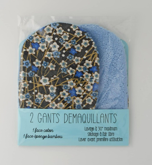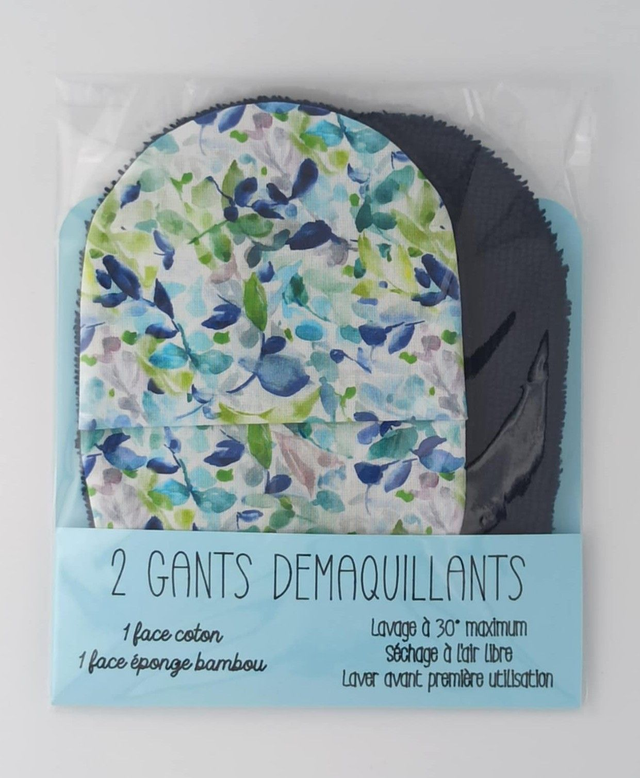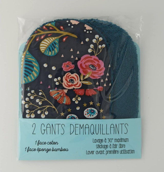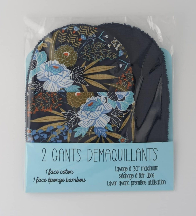 Coton imprimé fleurs bleues et vertes et éponge de bambou bleu marine
