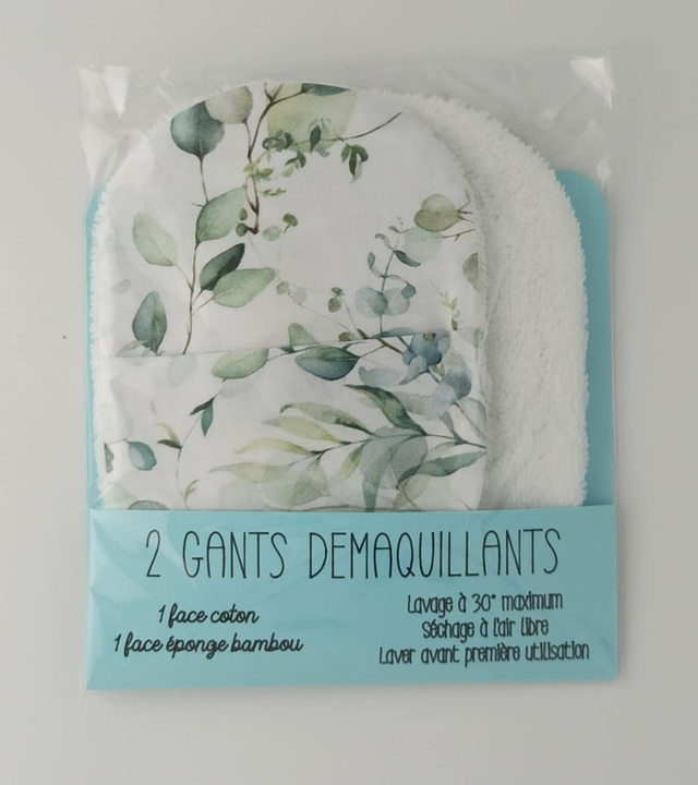 Débarbouillettes par 2 en coton imprimé eucalyptus et éponge de bambou blanc