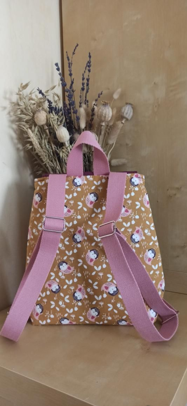 Sac à dos en coton avec bretelles réglables. Très pratique pour une rentrée en maternelle. Sa taille de 26 cm de hauteur, de 22 cm de largeur ses 10 cm de profondeur permet d’y ranger un rechange et un doudou (si il n’est pas trop gros).