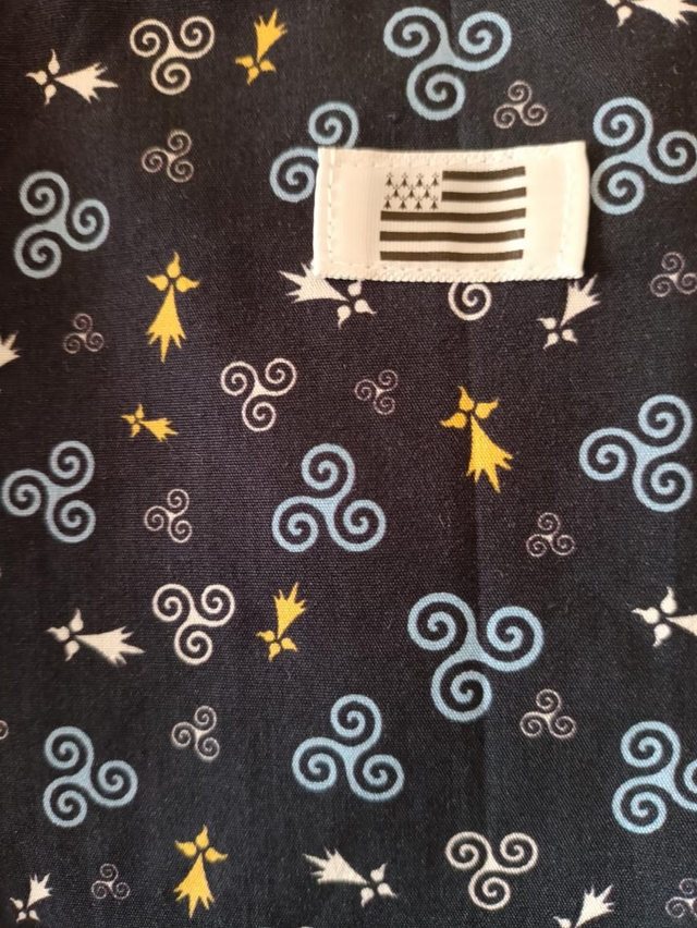 Intérieur du sac en coton blanc imprimé truskel breton jaune et bleu.